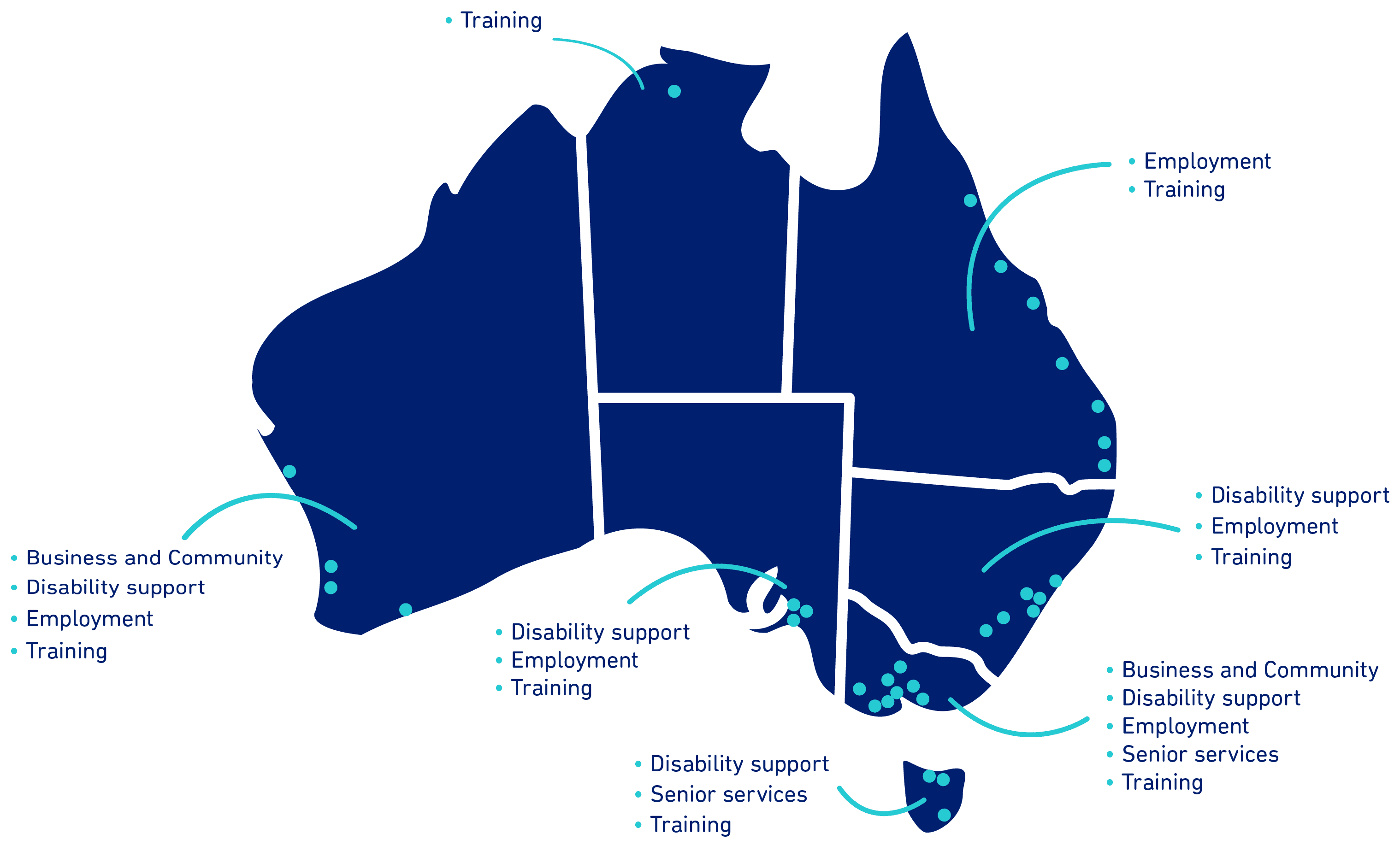 You'll find us on the ground delivering supports including allied health, accommodation, disability support, senior services, training, and employment.